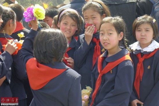 天真无邪:朝鲜的小孩们在准备学校的游行活动。