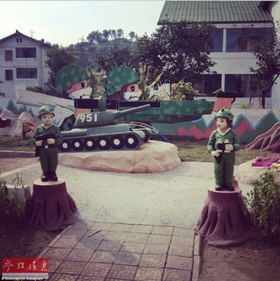 战争游戏:在一家农场里有一个罕见的儿童操场,被几只拿着枪、穿着军服的金花鼠“保卫”着。