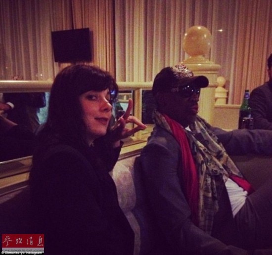 明星朋友:科克雷尔(左)获准观看2014年1月在平壤举行的朝鲜和美国篮球选手进行的友谊赛,只有少数人获得了这个资格。图片右侧为美国前NBA篮球明星罗德曼,后者声称与金正恩建立了良好的私人友谊。