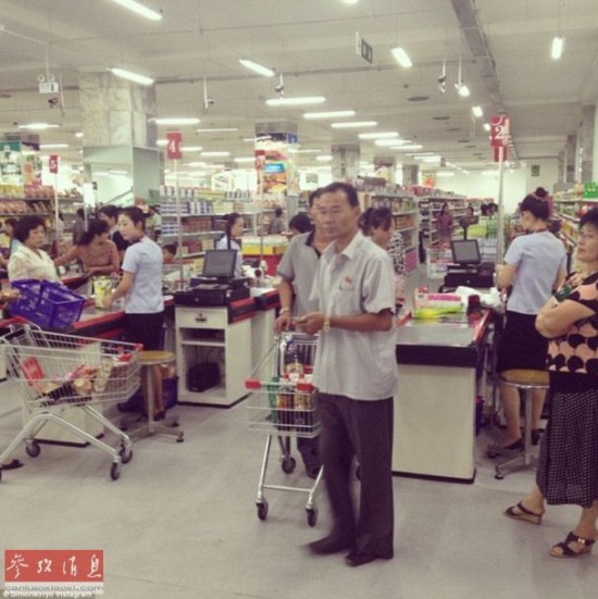 现代化:顾客在Kwangbok超市里购物,科克雷尔承认,游客很难看到朝鲜人生活中的样子,但是在这里很容易看到朝鲜人平时的样子,在和朝鲜人的互动中,可以发现,即使来自不同地方的人们,在很多方面都表现出相同的特性。