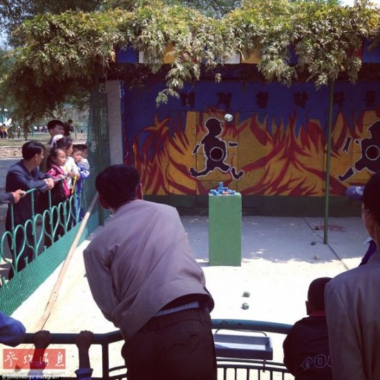 娱乐和游戏?当地人在平壤的大城山公园玩“反美游戏”。他能击中“美国人”吗?