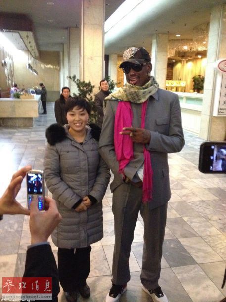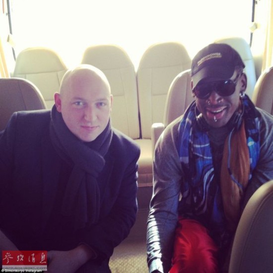 图为罗德曼和科克雷尔的一位朋友。“许多人并不知道,当天是金正恩的生日,罗德曼在篮球场发表了一番讲话后,唱起了生日歌。”