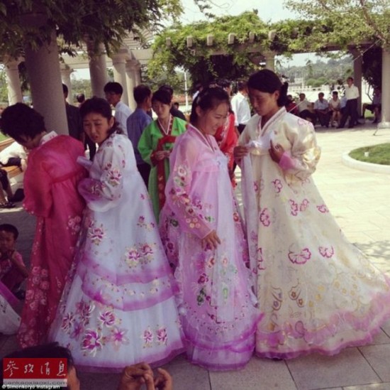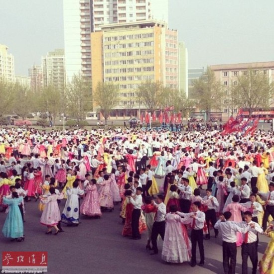 舞动奇迹:朝鲜民众身穿传统服装在平壤的一处广场上起舞。