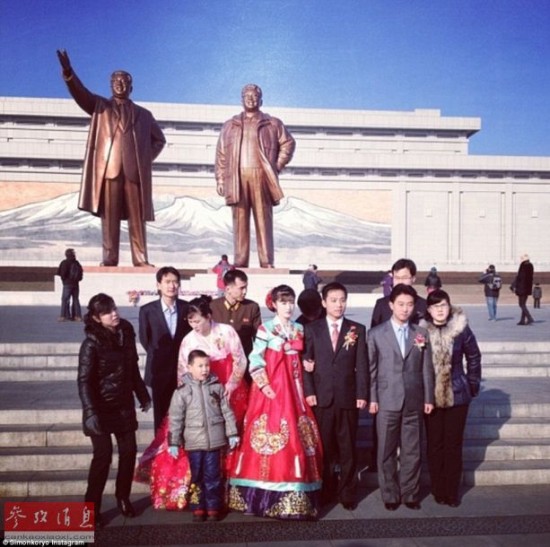 结婚:2014年1月的一个早上,有3对朝鲜新人举行了婚礼,其中一对新人在朝鲜首都的万寿台纪念碑前拍照留念。