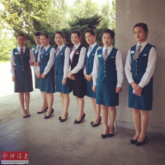 精美的装扮:漂亮的年轻服务员身穿蓝色的套裙和上装,在平壤的Jangjusan酒店。