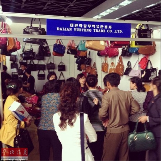 可支配收入:朝鲜人在国际贸易展览会上选购手袋。