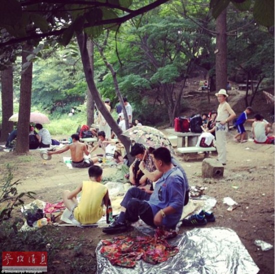 放松:在首都平壤的牡丹峰公园,朝鲜家庭尽其所能地享受雨中野餐。