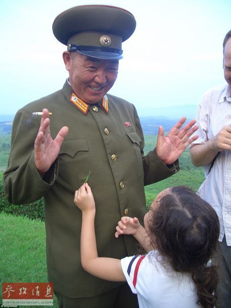 笑声:一名国家官员在与小女孩说着关于停在他制服上的蟋蟀的玩笑。这与西方人惯常从这个隐士王国看到的严肃的警察形象截然不同。