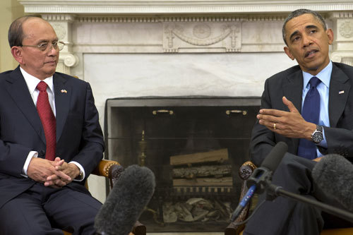 资料图片:美国总统奥巴马(右)会见缅甸总统吴登盛。