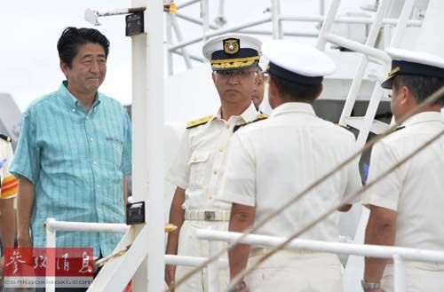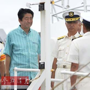 资料图片:在日本冲绳县石垣岛,安倍晋三(左一)视察海上保安厅的巡视船。