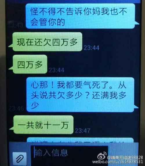 一名知情人士告诉记者,2014年11月,讷河监狱五监区犯人王东因涉嫌诈骗被齐嫩地区人民检察院收押审查。2014年以来,王东利用微信与监狱附近地区的多名女性聊天,并骗取钱财。讷河监狱一名民警给王东带进一部智能手机,供他消遣娱乐。王东利用手机微信,以王浩天(音)的名字,认识了多位监狱附近区域的女性,并与多位女性确定了情人关系。信息显示,与王东保持情人关系的女性至少有7名,其中至少有3名曾经给过王东钱。该7名情人中,至少有两人已婚。图为微信信息截图。