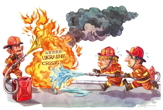 面对乌克兰危机,法德首脑忙灭火,美国暗浇油。(来源:中国日报 李旻 英文《中国日报》2015年2月9日8版)