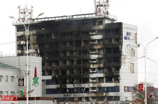 这是12月4日在俄罗斯车臣共和国首府格罗兹尼拍摄的遭袭的大楼。俄罗斯车臣共和国首府格罗兹尼4日遭到车臣武装分子袭击,俄安全部队随即对武装分子展开军事行动,击毙7名武装分子。新华社/路透