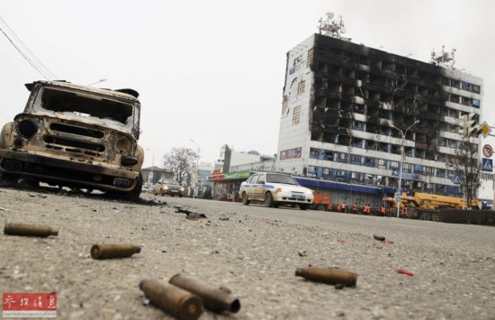 12月4日,在俄罗斯车臣共和国首府格罗兹尼市中心,一座被烧毁的大楼外弹壳落满地。俄罗斯车臣共和国首府格罗兹尼当日遭到车臣武装分子袭击,俄安全部队随即对武装分子展开军事行动,击毙7名武装分子。车臣共和国位于俄西南部高加索山脉北侧,是非法武装分子活动频繁的地区。新华社/美联