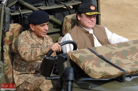 11月4日,在巴基斯坦旁遮普省的巴哈瓦尔布尔地区,巴总理纳瓦兹·谢里夫(右)同陆军参谋长阿什法克·基亚尼驱车前往军事演习地点。巴基斯坦总理纳瓦兹·谢里夫4日表示,尽管巴基斯坦塔利班首领哈基穆拉·马哈苏德在最近的美军无人机空袭中被打死,政府仍将寻求与塔利班进行对话。新华社/法新