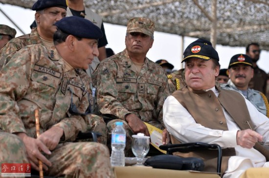 11月4日,在巴基斯坦旁遮普省的巴哈瓦尔布尔地区,巴基斯坦总理纳瓦兹·谢里夫(前右)同陆军参谋长阿什法克·基亚尼(前左)观看军事演习。新华社/法新
