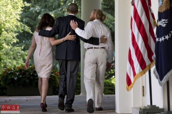 5月31日,美国总统奥巴马(中)与被阿富汗塔利班俘虏的唯一一名美军士兵鲍·伯格达尔的父亲鲍勃和母亲贾妮在华盛顿白宫出席新闻发布会后离开。美国总统奥巴马5月31日宣布,被阿富汗塔利班俘虏的唯一一名美军士兵鲍·伯格达尔已于当天获释。美国媒体称,这是美方用关押在美军关塔那摩监狱的5名塔利班囚徒交换的结果。伯格达尔于2009年6月30日在阿富汗失踪,后被证实落入塔利班之手。新华社/美联
