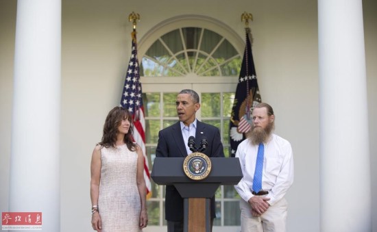 5月31日,美国总统奥巴马(中)与被阿富汗塔利班俘虏的唯一一名美军士兵鲍·伯格达尔的父亲鲍勃和母亲贾妮在华盛顿白宫出席新闻发布会。新华社/美联