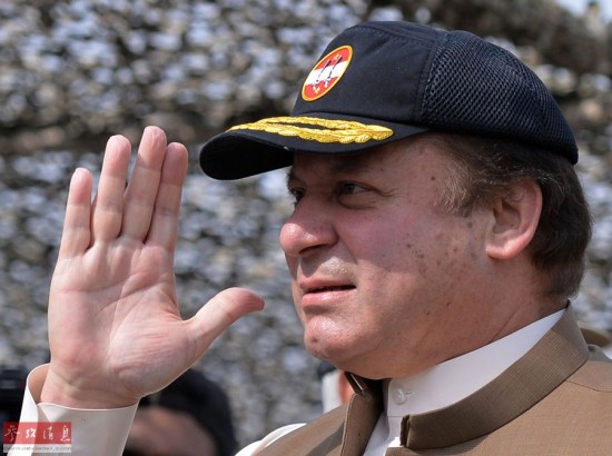 11月4日,巴基斯坦总理纳瓦兹·谢里夫在旁遮普省的巴哈瓦尔布尔地区观看军事演习时挥手致意。新华社/法新