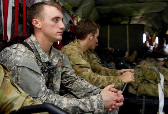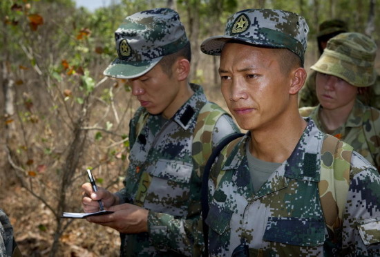 这次军事演习的规模并不大,有10名澳陆军成员、10名中国解放军、5名美国陆军,以及5名美国海军陆战队成员参加,另外还有100名军事人员为这次演习担任联络和后勤保障等支援工作。图为三国士兵准备搭乘澳军CH-47前往生存训练起点。