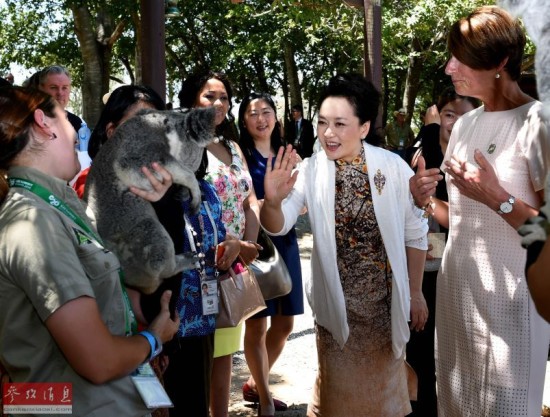 11月15日,中国国家主席习近平夫人彭丽媛在布里斯班出席澳大利亚总理夫人玛格丽特为G20与会各成员领导人配偶举行的龙柏考拉园参观活动。这是彭丽媛在观赏考拉。