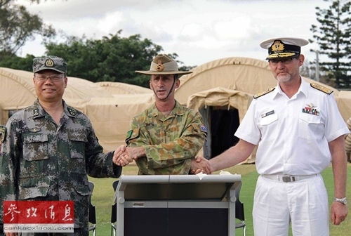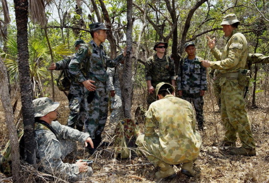 澳大利亚、中国和美国三国首次国防合作演习“科瓦里演习2014”(Exercise?KOWARI?14),7日起在澳大利亚北领地展开。这次澳中美三国首次进行的野外生存训练演习,以达尔文的拉拉基亚军营为基础,主要内容是在边远的内陆及沿海地区进行野外训练和生存测试。图为中美澳三国士兵在丛林中合影。