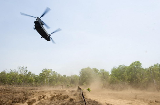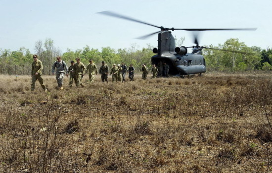 主持这次演习的是澳洲陆军第二师,西北机动部队(NORFORCE)负责执行生存训练项目。这次演习的指挥官、陆军准将克雷(Peter?Clay)表示,澳洲对能主办“科瓦里演习2014”感到高兴,“这次演习将为参与各方提供某些极度具有挑战性的生存环境以供克服,其中一些更是位于澳洲所能提供的最为严酷的地理环境。这些军人为了完成任务,必须要完全相互依赖。按计划,“科瓦里演习2014”将于本月25日结束。图为载着三国士兵的澳军CH-47抵达生存训练起点。