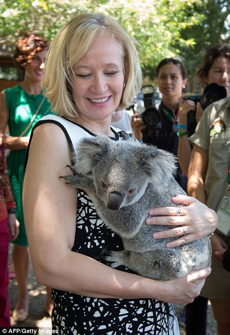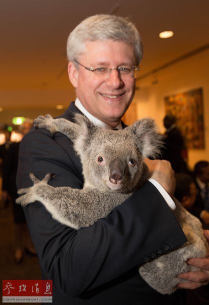 图为加拿大总理哈珀的妻子劳润抱着考拉。