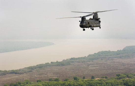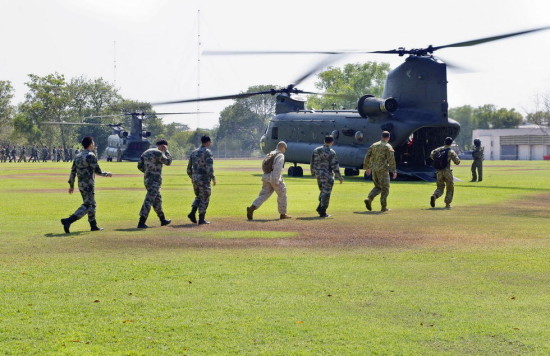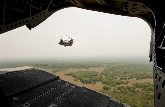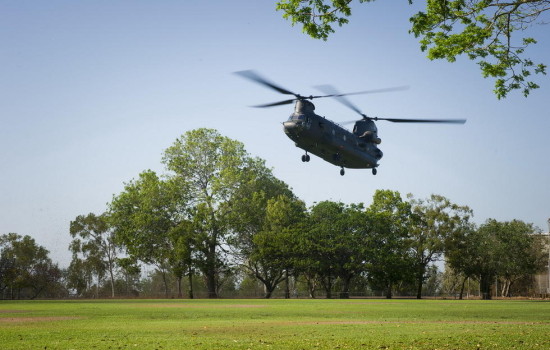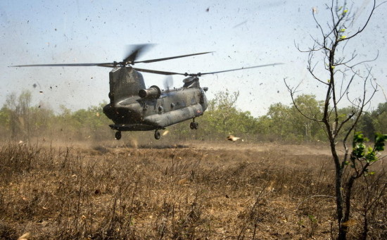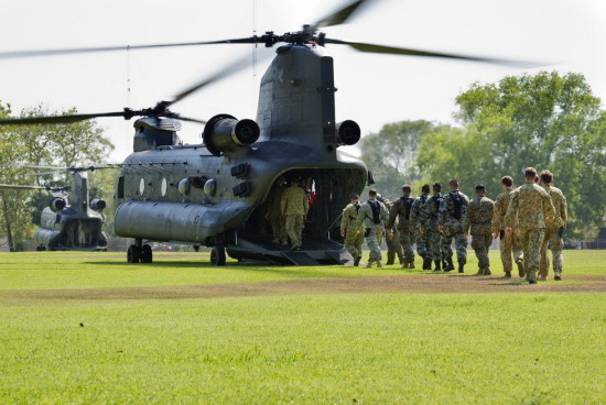 载着三国士兵的澳军CH-47抵达生存训练起点。