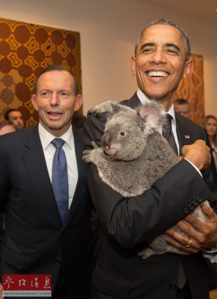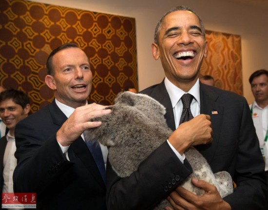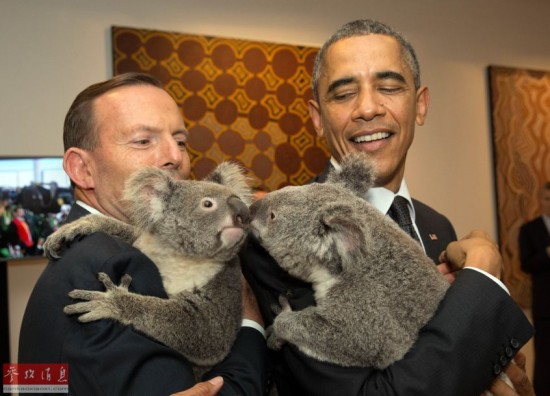 当地时间2014年11月15日,澳大利亚布里斯本,G20峰会在当地举行,美国总统奥巴马与澳大利亚总理阿博特怀抱考拉,两只考拉甜蜜亲亲。