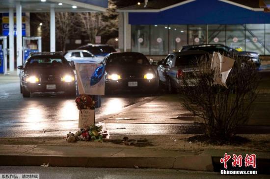当地时间2014年12月24日,美国圣路易斯郡警察局局长贝尔马公布加油站监控录像并证实,23日晚,一名白人警察响应盗窃报警,在伯克利一处加油站看到两名男子,随即步出警车对他们例行检查。其中一名非裔青年手持子弹上膛的9毫米口径手枪指向警员,警察随即开枪将其射杀。图为在案发现场加油站附近的悼念花束。