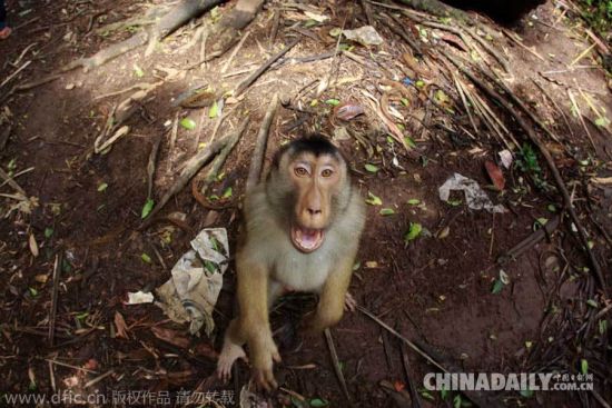 当地时间2015年2月28日报道(具体拍摄时间不详),印尼西苏门答腊省帕里亚曼,7岁的猪尾猴阿古斯可是非常注重自己肖像权的,这不,它正向私自对着它拍照的摄影师尤利·塞佩里大秀功夫抗议呢。(图片:东方IC)