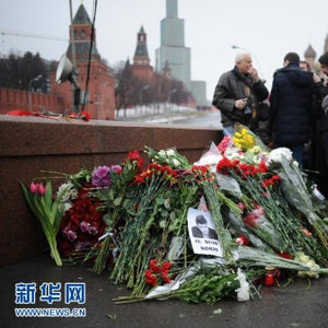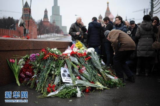 2月28日,在俄罗斯首都莫斯科,人们在涅姆佐夫遭枪击身亡现场摆放鲜花。俄罗斯反对派领导人、前副总理鲍里斯·涅姆佐夫27日晚在莫斯科市中心遭身份不明人员枪击身亡。俄罗斯调查委员会已经确认这一消息并展开刑事调查。新华社记者戴天放摄