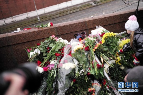 2月28日,在俄罗斯首都莫斯科,一名女孩在涅姆佐夫遭枪击身亡现场摆放鲜花。俄罗斯反对派领导人、前副总理涅姆佐夫27日晚遭枪击身亡后,俄总统普京迅速责成有关部门成立专门小组调查此案,并要求随时向他汇报调查进展。新华社记者戴天放摄