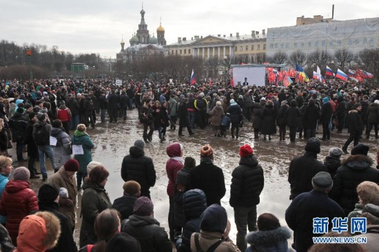 3月1日,人们在圣彼得堡参加游行集会,纪念遇害的反对派领导人涅姆佐夫。涅姆佐夫2月27日晚在红场附近的一座桥散步时遭不明身份人员枪击身亡,俄总统普京要求成立专门小组调查此事,并表示一定要将凶手绳之以法。新华社发(莫京娜 摄)