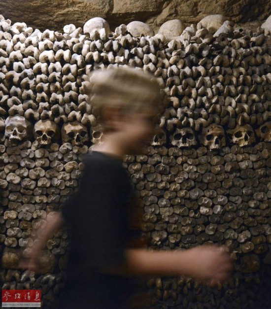 2014年8月7日,法国巴黎,游客参观巴黎地下墓穴,地穴中共藏有超过600万具人类尸骨。在18世纪因为巴黎爆发天花疫症和瘟疫,大批巴黎居民死亡,而地面的公墓面积严重不足,于是当时的市长决定挖坑,将死者埋进土中,一个月后再把剩下的骨头拿出来填进地下坑道和一些地下建筑中,于是部分地下隧道便会通往这些放满骨头的地下建筑中。图为一名小男孩,在快速走过骷髅墙。