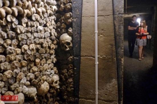 2014年8月7日,法国巴黎,游客参观巴黎地下墓穴,地穴中共藏有超过600万具人类尸骨。在18世纪因为巴黎爆发天花疫症和瘟疫,大批巴黎居民死亡,而地面的公墓面积严重不足,于是当时的市长决定挖坑,将死者埋进土中,一个月后再把剩下的骨头拿出来填进地下坑道和一些地下建筑中,于是部分地下隧道便会通往这些放满骨头的地下建筑中。图为两名游客在游览巴黎地下墓穴。