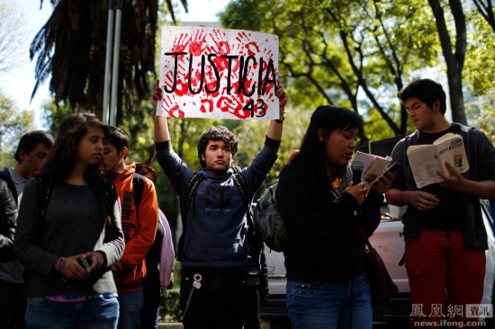 事件一出在墨西哥不断引发示威游行。图为一名示威者举起一块写着“正义”的标语牌。