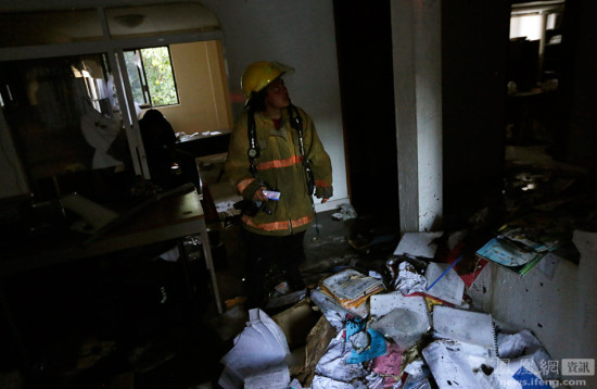 图为一名消防员在被抗议者烧毁的格雷罗州政府教育办公室内。