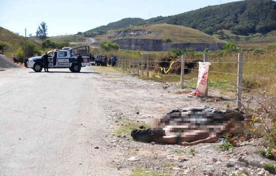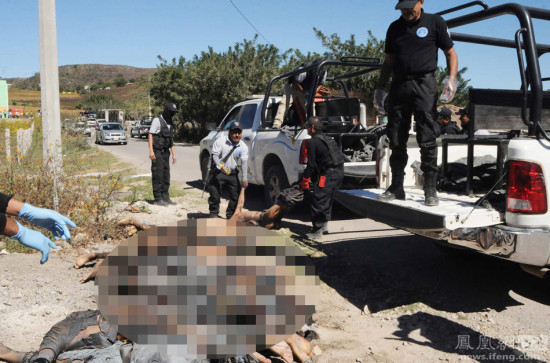 当地时间2014年11月27日,墨西哥格雷罗州奇拉帕,当地警方在路边发现了11具残缺的尸体,其中许多尸体被斩首。奇拉帕位于格雷罗州,与43名失踪学生被绑架并屠杀的地点同属一州。图为发现无首残尸现场。