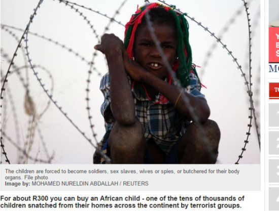 台湾东森新闻网援引南非新闻网站《时报即时消息》的报道称,伊斯兰激进分子如IS等开车大量捕捉非洲大湖区北方儿童。南非人权委员会调查员沃德(Rachel Ward)也指出,恐怖组织经常透过不同的管道来获取所需资源,如贩卖人口来取得大量资金。