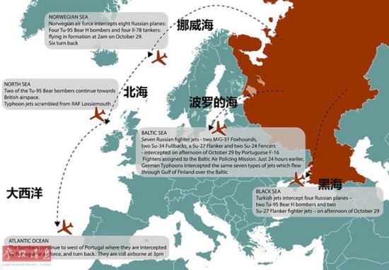 图为2014年10月28日至29日,北约军机拦截俄军机示意图,北约盟军作战指挥部披露,北约至少8个成员国的空军在两天内拦截了至少26架俄罗斯军机,这是近年来,俄空军威慑活动最为频繁的两天,有西方媒体称,俄罗斯在这天拉响了战争警报。