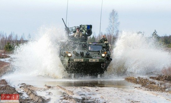 2015年2月24日,爱沙尼亚在俄爱边境小镇纳尔瓦举行独立日阅兵,美军携140多件北约军事装备首次参加阅兵,阅兵式距离俄罗斯仅有一河之隔。图为参加阅兵的美军斯特赖克 步兵战车。