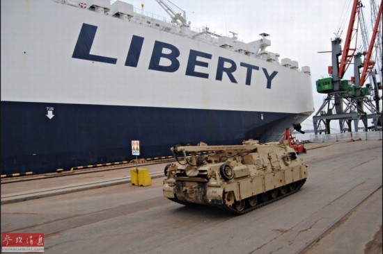 2015年3月9日,为对俄表现强硬姿态,美军又向拉脱维亚交付了120辆战车,包括最新的M1A2坦克和M2A3步兵战车。图为M1A2坦克驶上码头。