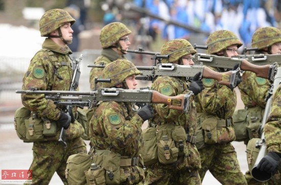图为身穿林地数码迷彩服的爱沙尼亚陆军机枪手方阵。