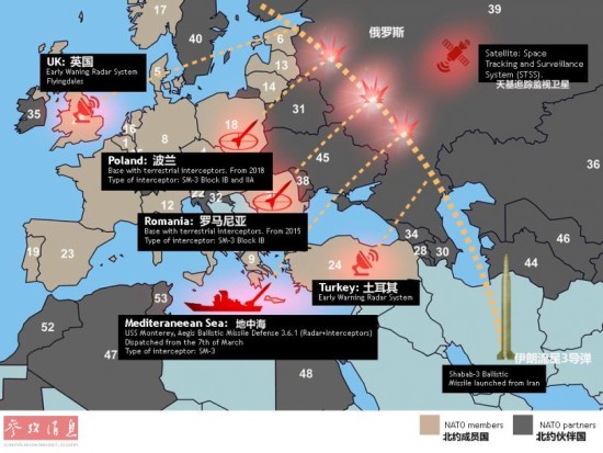 除了常规军力的较量外,双方的“长线较量”也在继续,图为2011年9月公布的一张北约东欧反导系统分布示意图,虽然当时图中特意将俄罗斯划入了“北约伙伴国”,但明眼人都能看出这个系统针对的真正目标正是俄罗斯,而非伊朗。