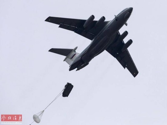 ?图为2014年11月的联合军演中,俄空军伊尔76运输机空投BMD空降战车的瞬间。