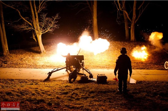 就在同一天,俄军也在多个地区进行了“礼尚往来”的行动,图为2015年2月24日夜,加里宁格勒军区炮兵部队开炮庆祝“祖国保卫者”日。
