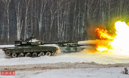 ?图为2015年2月初,隶属于俄陆军最精锐的第四近卫坦克师的T-80坦克部队进行实弹演习。