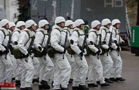 图为身穿雪地伪装服参加阅兵的爱沙尼亚陆军士兵方阵。